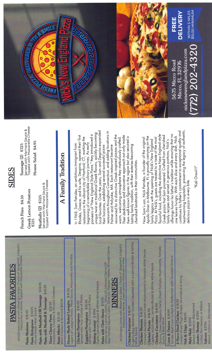 Welcome to Nick's New England Pizza, where authentic East Coast flavors meet a warm, family-friendly atmosphere in Sebastian, FL. Located at 5675 Micco Rd, this quaint eatery prides itself on serving quality dishes that reflect the owner's New England heritage.
